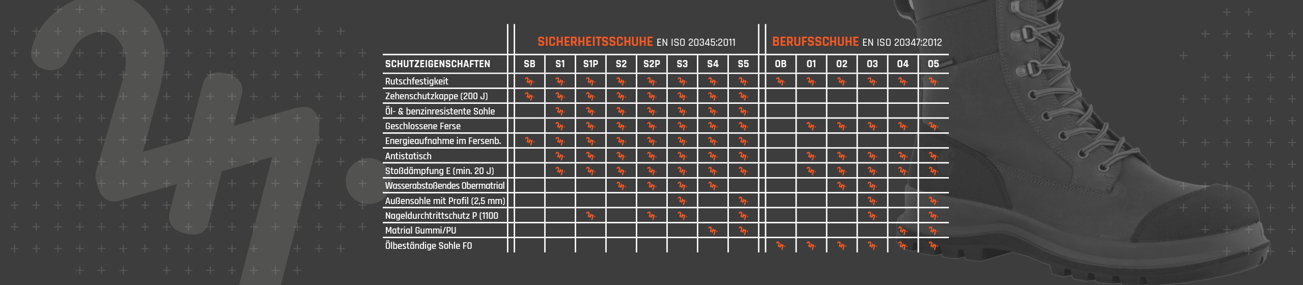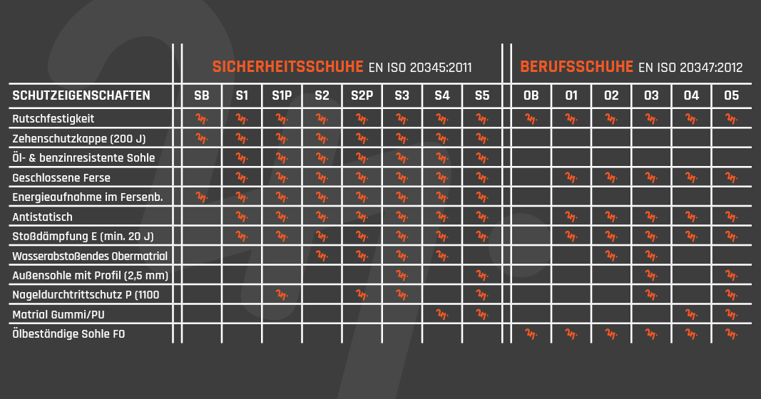 Entspricht den Grundanforderungen (Schuhe mit genormte Zehenschutzkappen), antistatisch (A), Energieaufnahme im Fersenbereich (E), Kraftstoffbeständigkeit Sohle (FO), Beständigkeit des Schuhoberteils gegen Wasserdurchtritt und Wasseraufnahme (WRO), wasserdichter Vollgummischuh bzw. Stiefel, Durchtrittsicherheit (P)